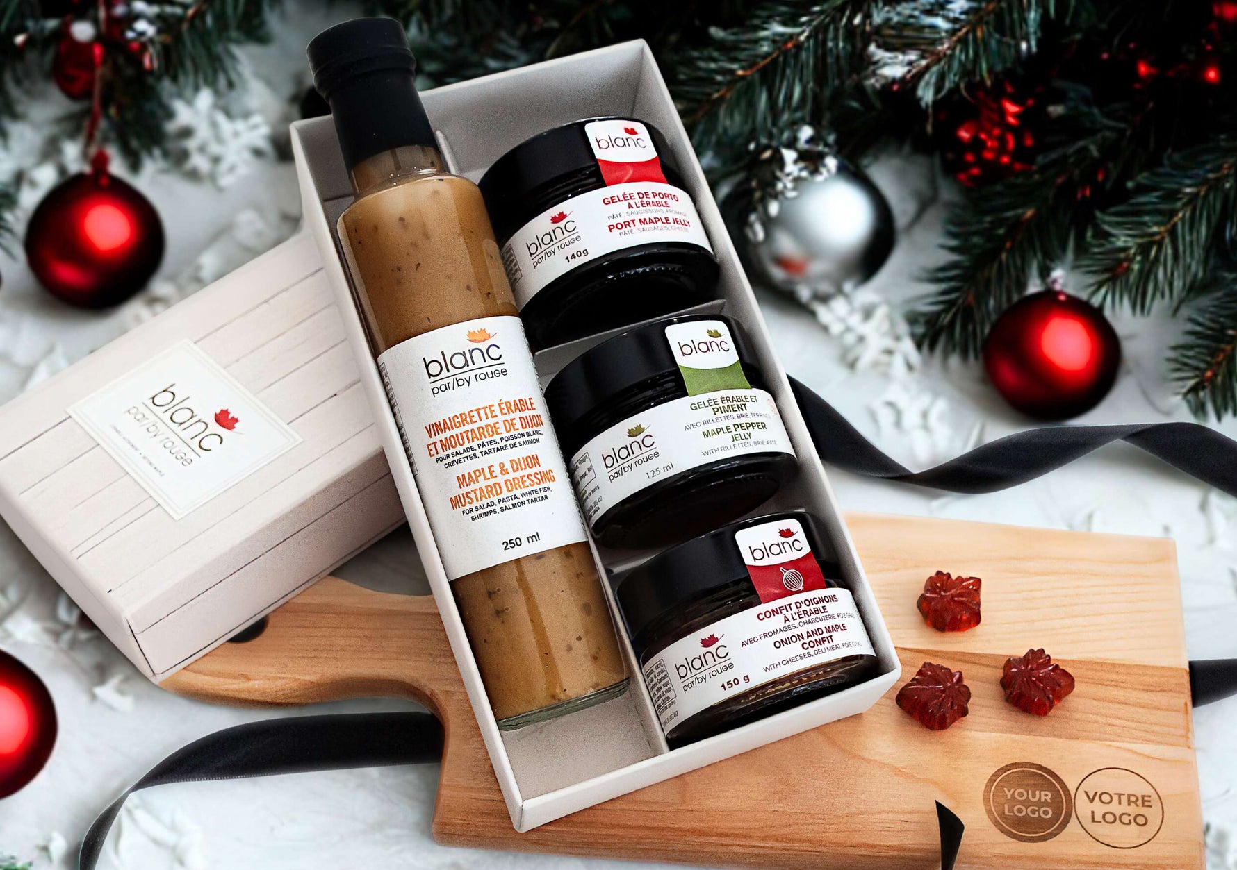 This set includes our 3 cheese companions, our maple vinaigrette and Dijon mustard, as well as a cheese board with a maple wood handle.
